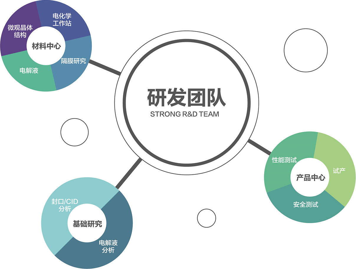 公司建立了國內一流的鋰電池研究實驗室,引進全套先進的試驗設備,其中包含進口Arbin電池測試系統、Apreo場發射電子顯微鏡、氣相色譜質譜聯用儀、全自動X-RAY透視檢測設備等高端精密儀器和一條鋰電池中試生產線。技術、工藝、設備研發人員三位一體的研發模式,完成公司研發課題。